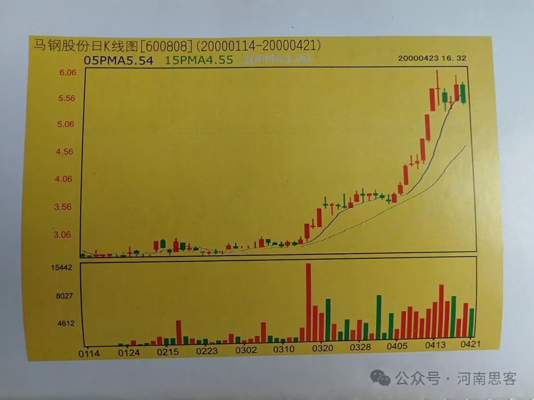 2000年的明星股,马钢股份(600808),这张是目前国内唯一印到公开出版物上,反映该股上涨的走势图(杨海燕摄制)