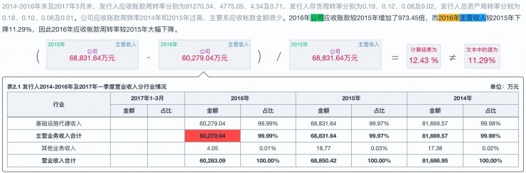 如下图所示,根据文档中的表格数据,机器可自动计算出“2016年主营收入较2015年下降的比例”应该为“12.43%”,但文字中的显示为“11.29%”。