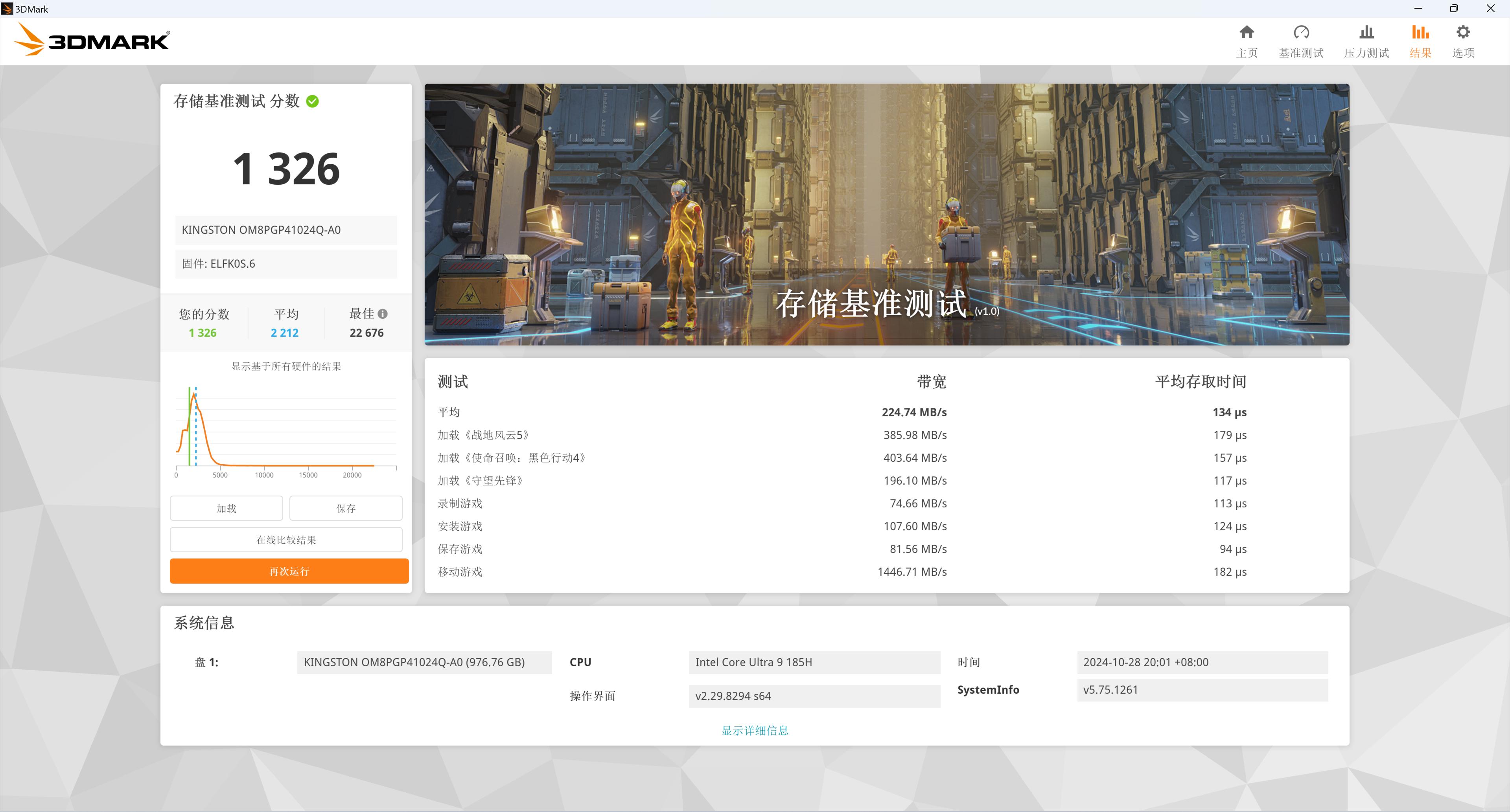 金士顿的SSD实测了一下, 在3D mark的存储基准测试中得分1326;