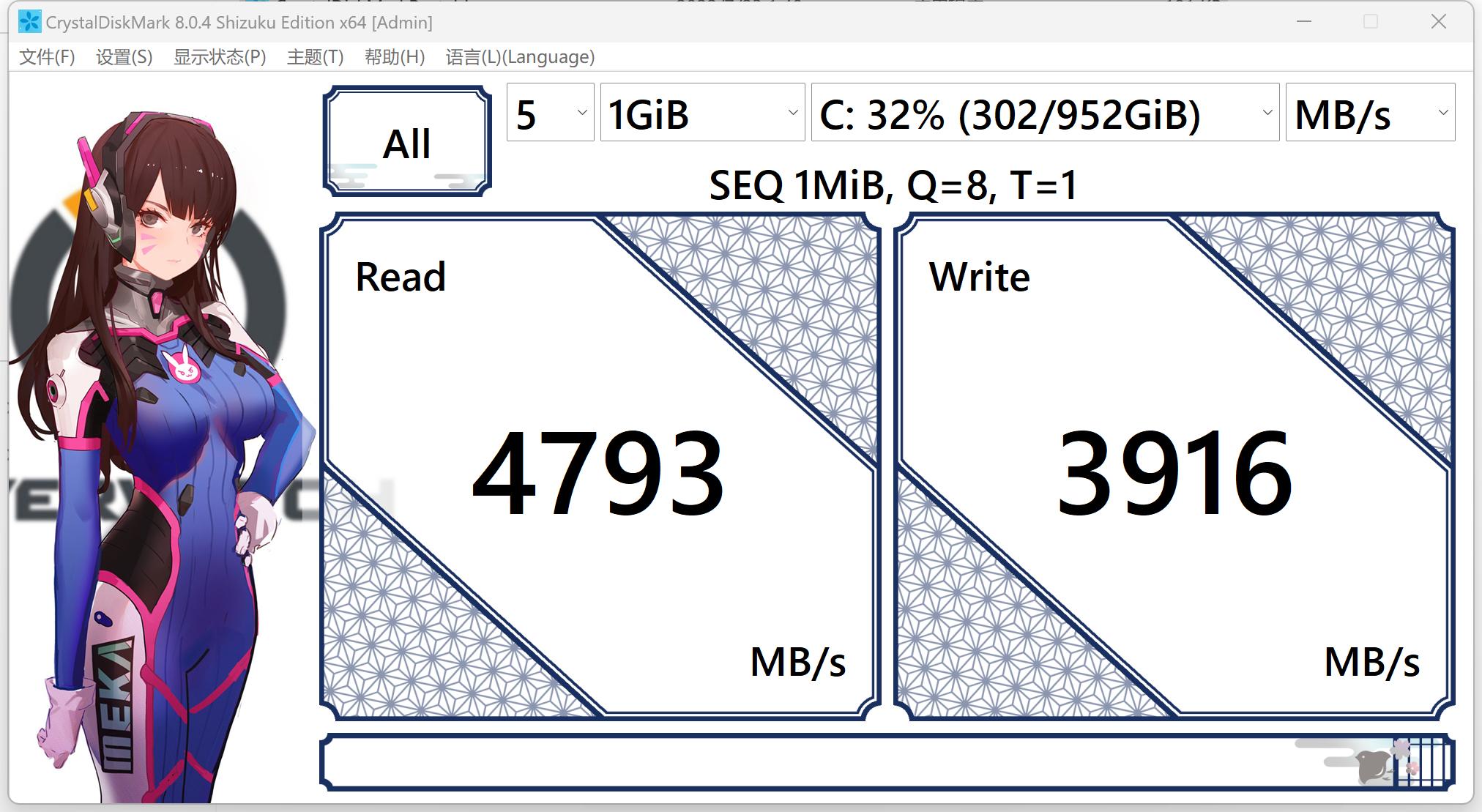 CrystalDiskMark中读取最高4793MB/s,写入最高3916MB/s。