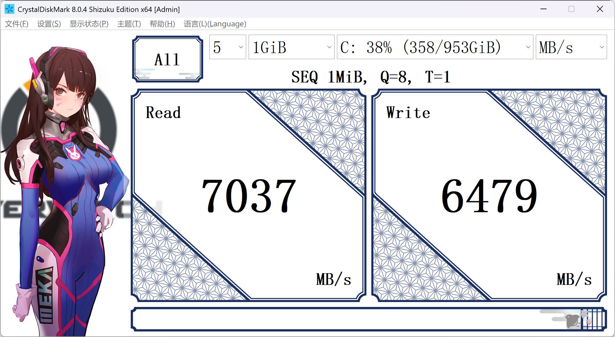 使用CDM再进行测试,读取实测7037MB/s,写入达到6479MB/s,速度大大提升了。