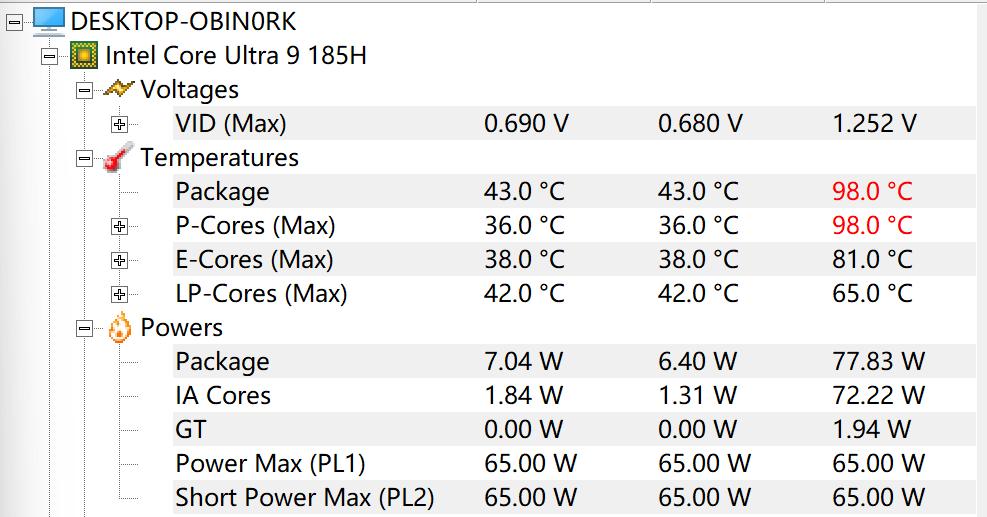在R23/R24测试结束后,X7 Ti的CPU最高温度为98°C,瞬时功耗最高来到了77.83W。手摸机器却并不热,放在散热鳍片出风口位置可以感受到一点点热风,但量也极小。机器的风扇转速达到顶峰时,能感觉到噪音但并不大,属于可以忍受的范围。