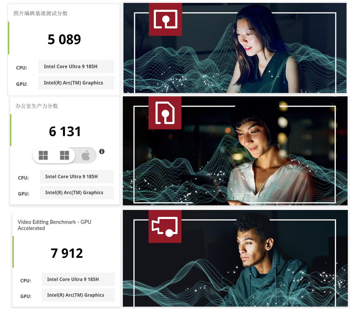 照片编辑是以Photoshop与Lightroom进行测试,得分为5089分,对比AMD最新的HX 370为6668分;