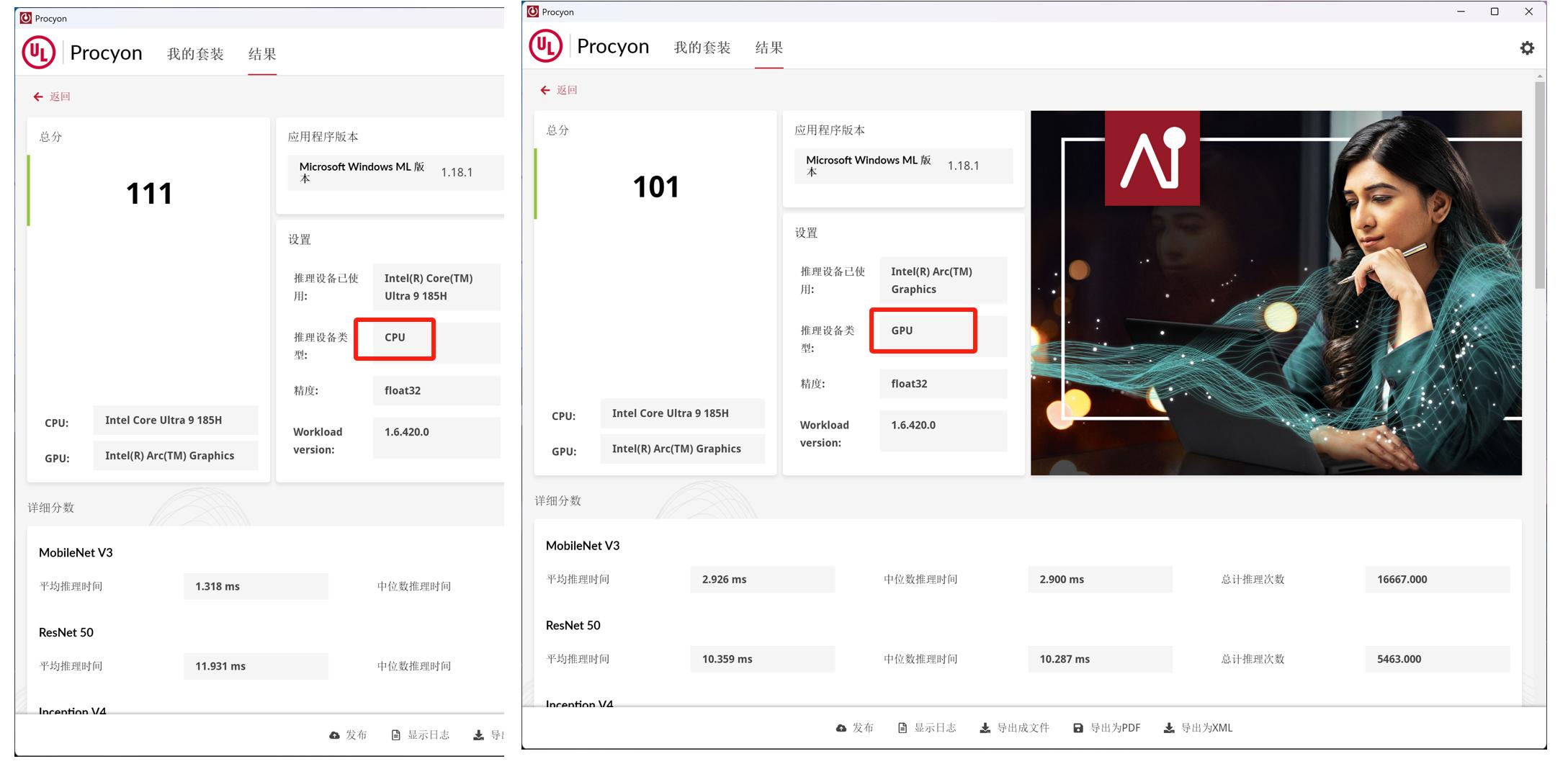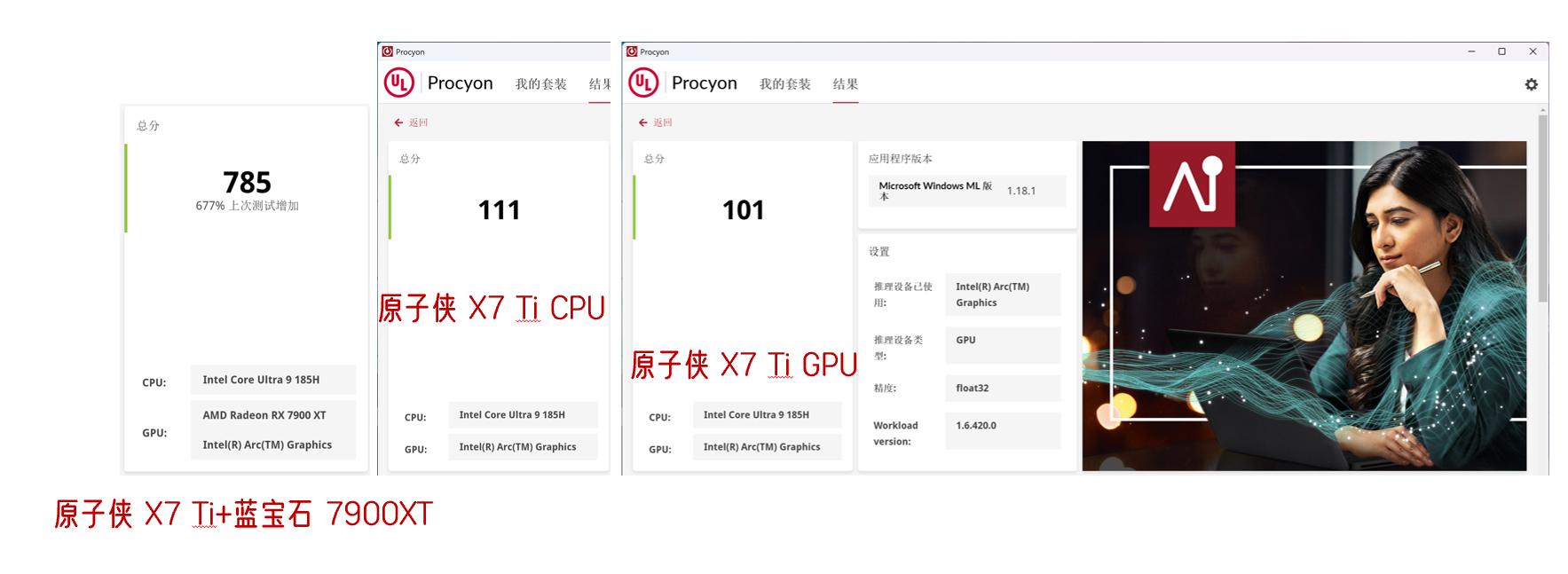 AI测试使用Windows ML进行测试, 这是微软开发的API,可以在 Windows设备上实现高性能AI推理。这项测试允许选择CPU或GPU进行,原子侠X7 Ti的Ultra 9 185H在CPU得分111分,GPU得分101分。