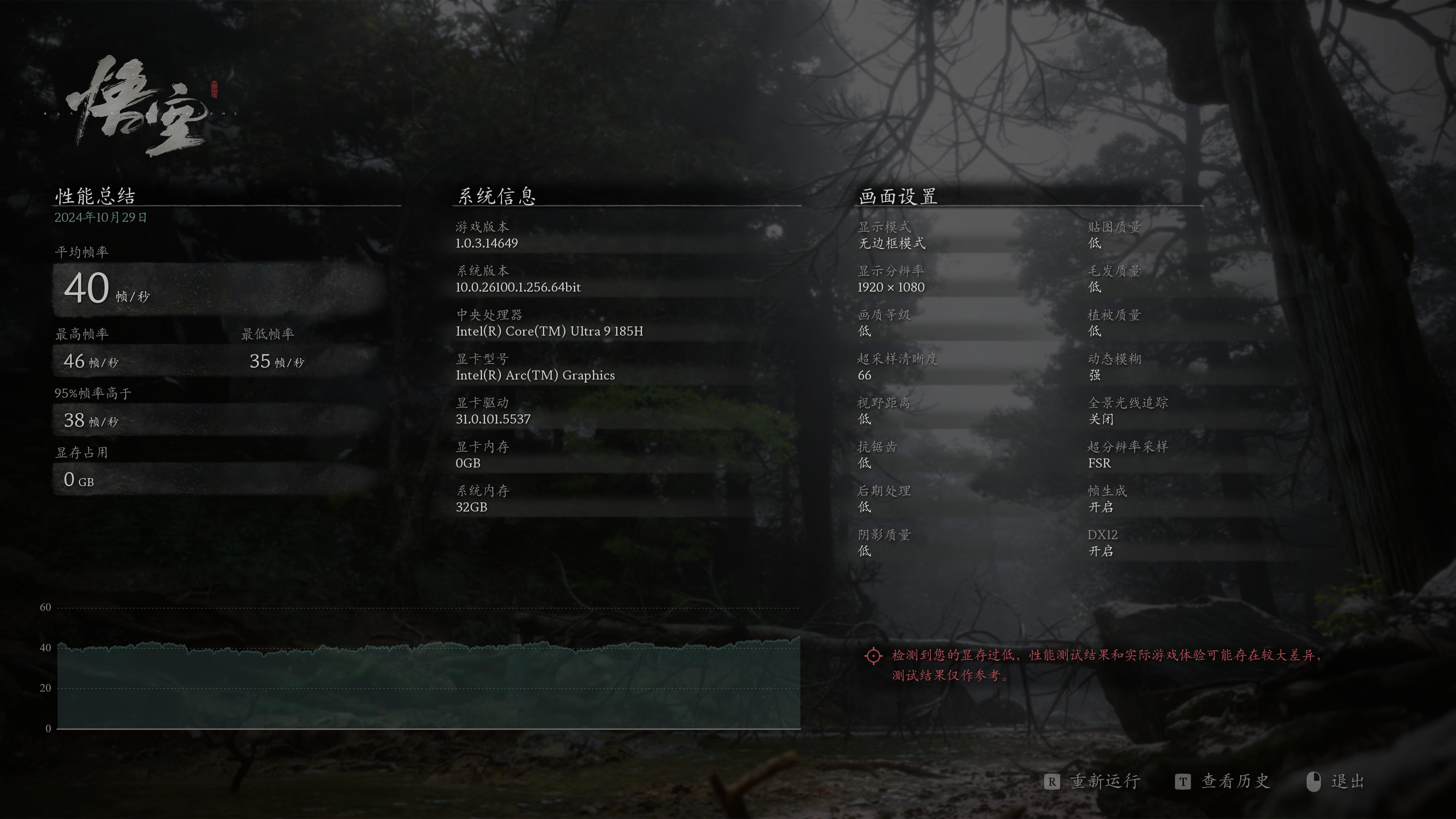 最流行的黑神话,1080分辨率最低画质下多屏炒股电脑,官方评测工具有40帧的水平,属于勉强可玩的程度。