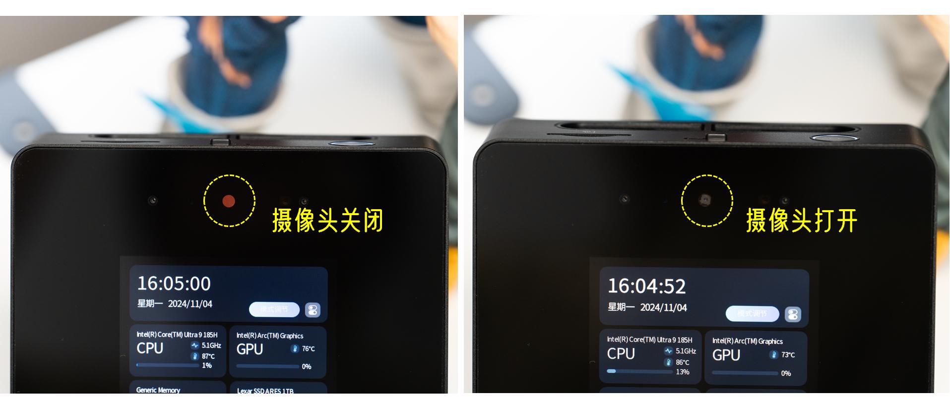 摄像头顶部带有物理遮挡开关,左右拨动即可遮蔽/打开。