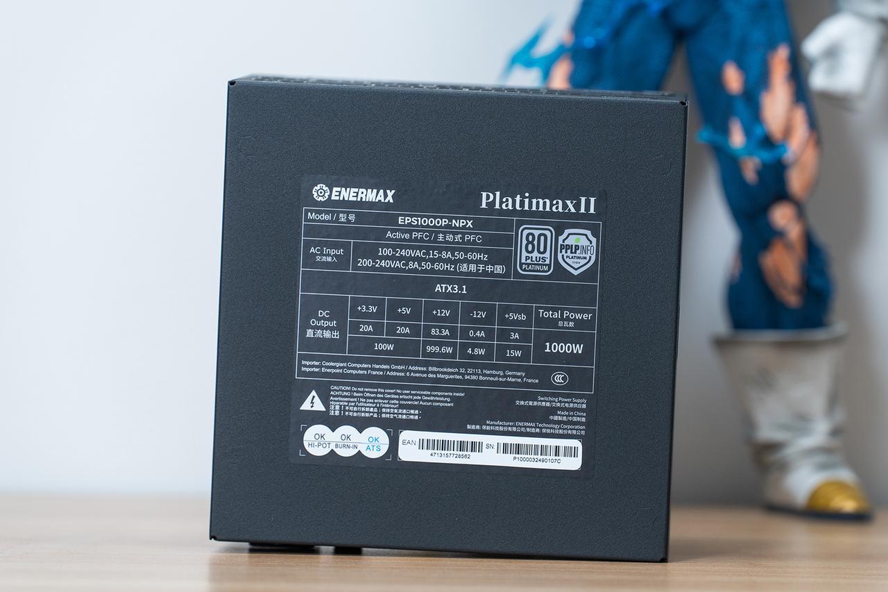 我使用的是安耐美白金全模 Platimax II 1000DF,它电容全部为日系三大品牌的高品质电容,产品符合PCIe5.1标准、符合ATX3.1标准,瞬时峰值功率高于ATX3.0标准!转换效能虽然是白金级别但转换效率高达93.2%,已经是接近钛金级的转换效率。