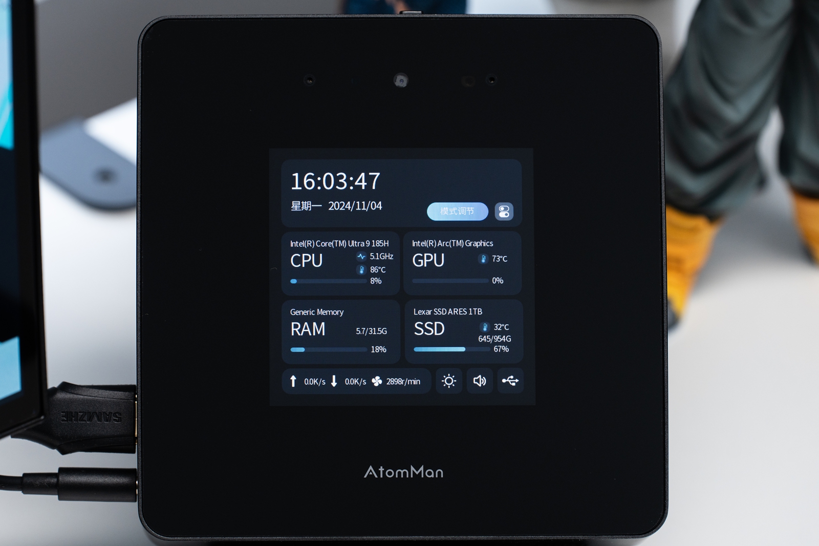 屏幕支持触控操作,目前可以在上面调节三档运行模式(45W/54W/65W)、音量、监控屏亮度等功能,点击USB与各监控板块暂时没有具体功能,估计后续还能进一步OTA升级。