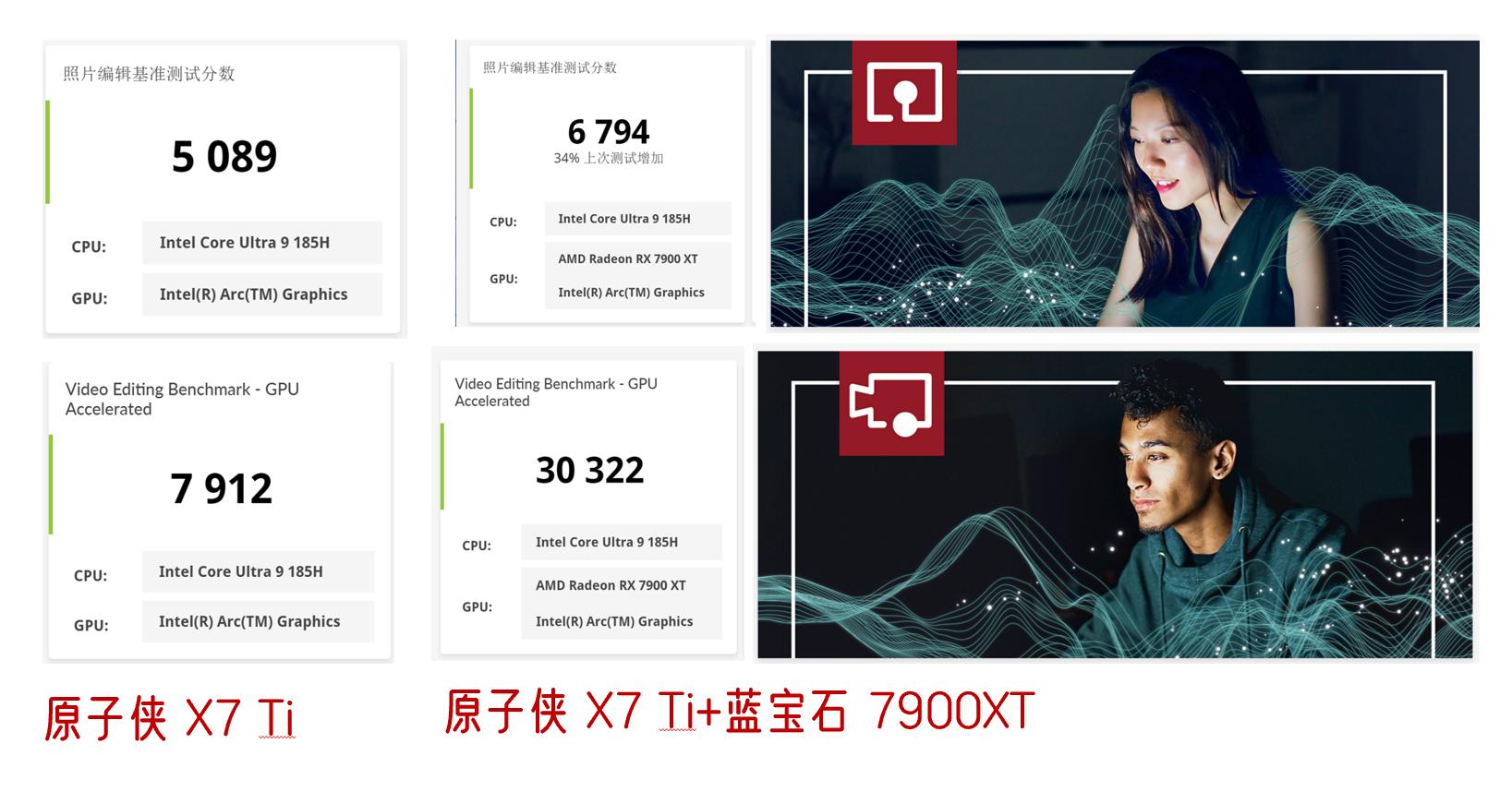 从生产力来说看,原子侠X7 Ti在使用扩展坞搭配7900XT前后差距最大的在视频编辑上,图片编辑增加得不多。