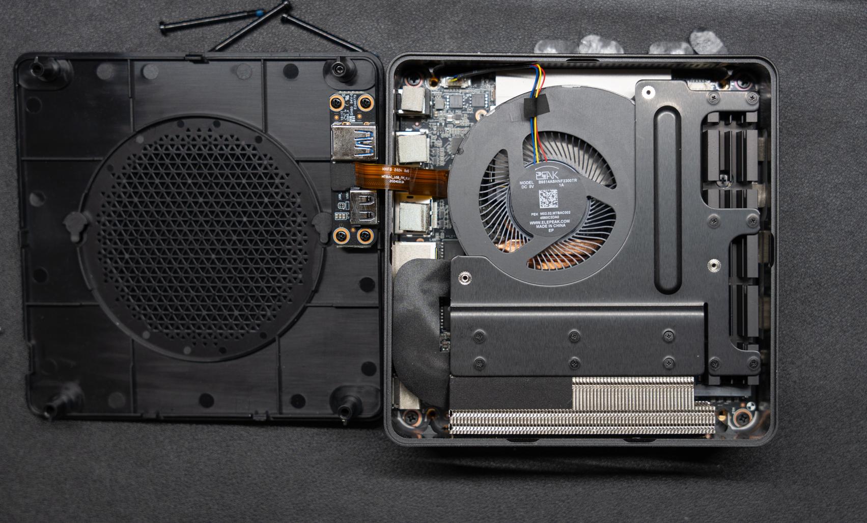 取下底部4个脚垫拧开螺丝再拆开盖子,就可以看到加固支架、散热鳍片与散热风扇。