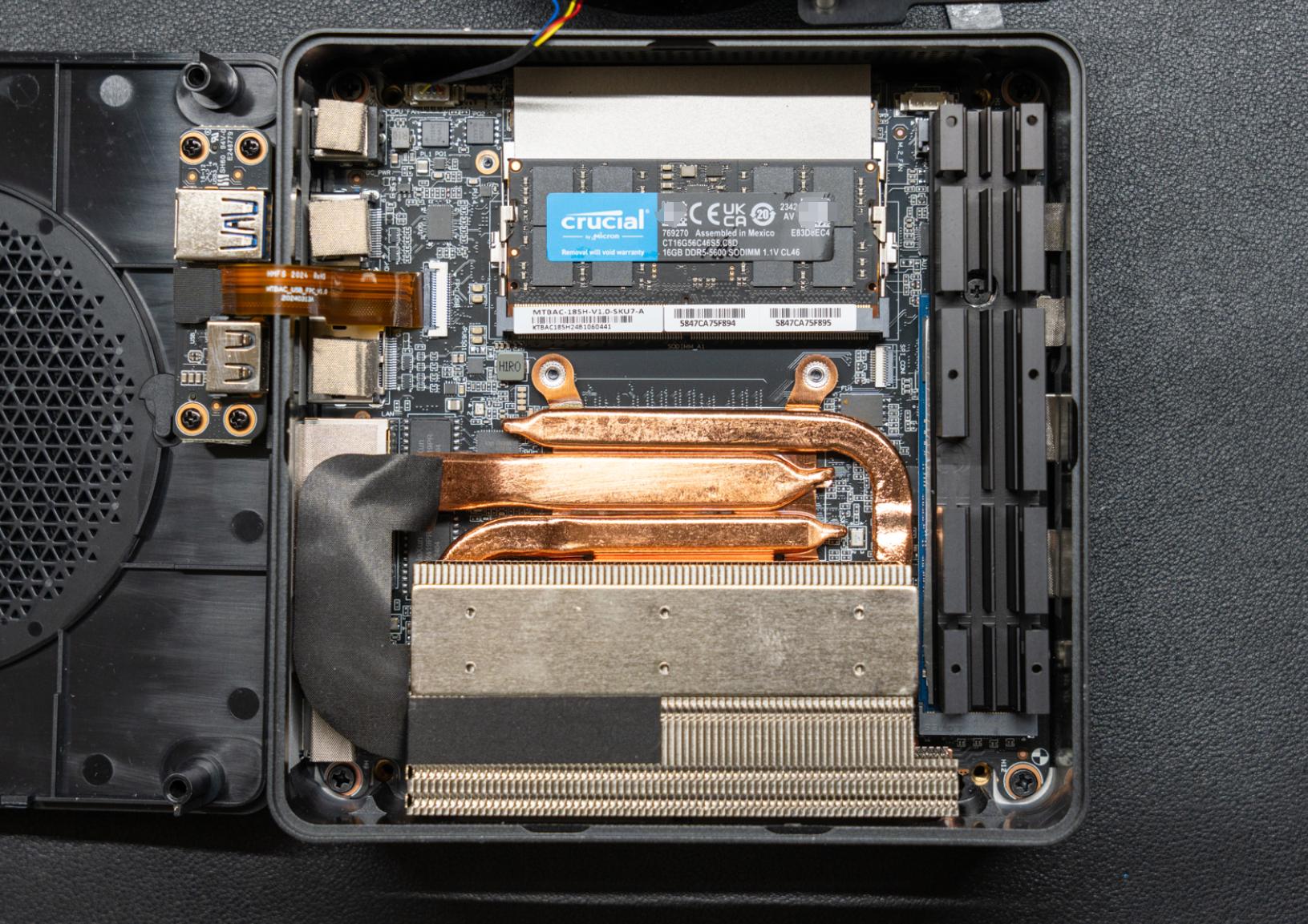 取下风扇与加固支架,能看到被绝缘贴纸盖住的内存,撕开后看到内存是英睿达16G DDR5 5600,两条组成32G的双通道,内存可以自行更换。